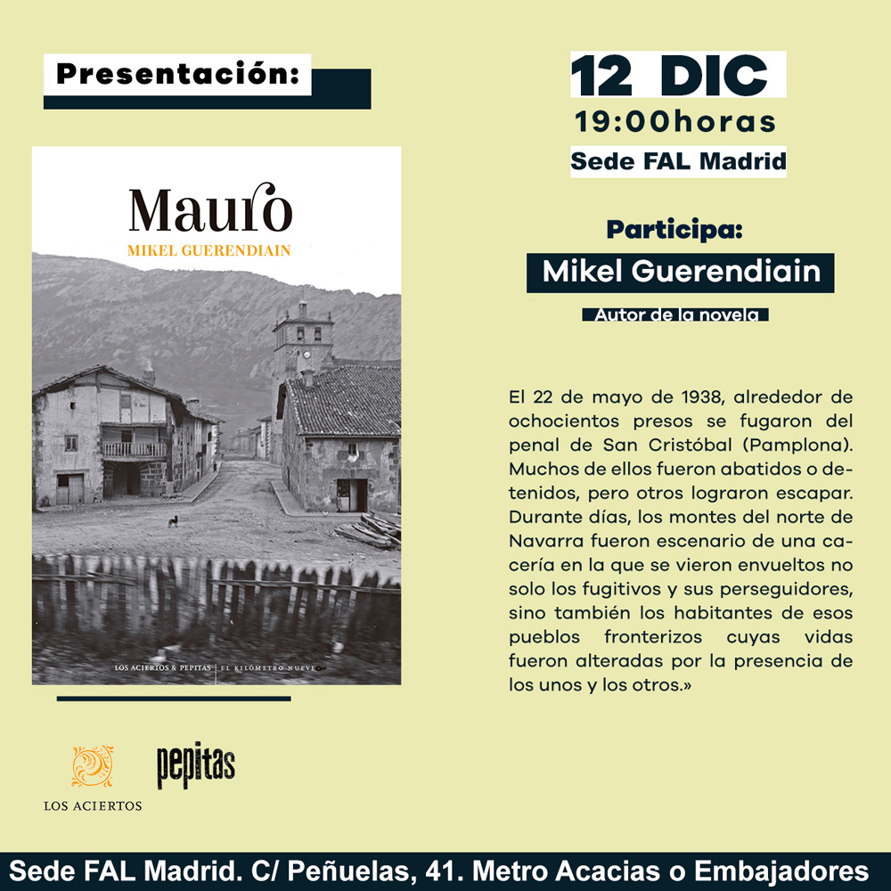 El viernes, 12 de diciembre, se presentará el libro Mauro, de Mikel Guerendiain. Será en la sede de nuestra fundación, en Madrid, a las 19:00. Contaremos con la presencia del autor de esta novela, centrada en los sucesos del 22 de mayo de 1938, cuando alrededor de 800 presos escaparon de la cárcel de San Cristóbal, bajo control franquista.