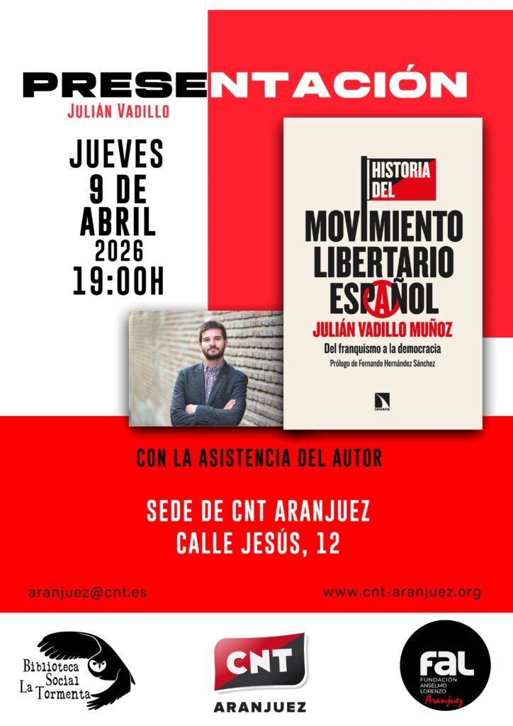 El jueves, 9 de abril, el historiador Julián Vadillo presentará su libro Historia del movimiento libertario español: Del franquismo a la democracia. Será en la sede de CNT Aranjuez en un acto organizado por la propia militancia del sindicato, por la Biblioteca Social La Tormenta y la Delegación de la FAL en Aranjuez.