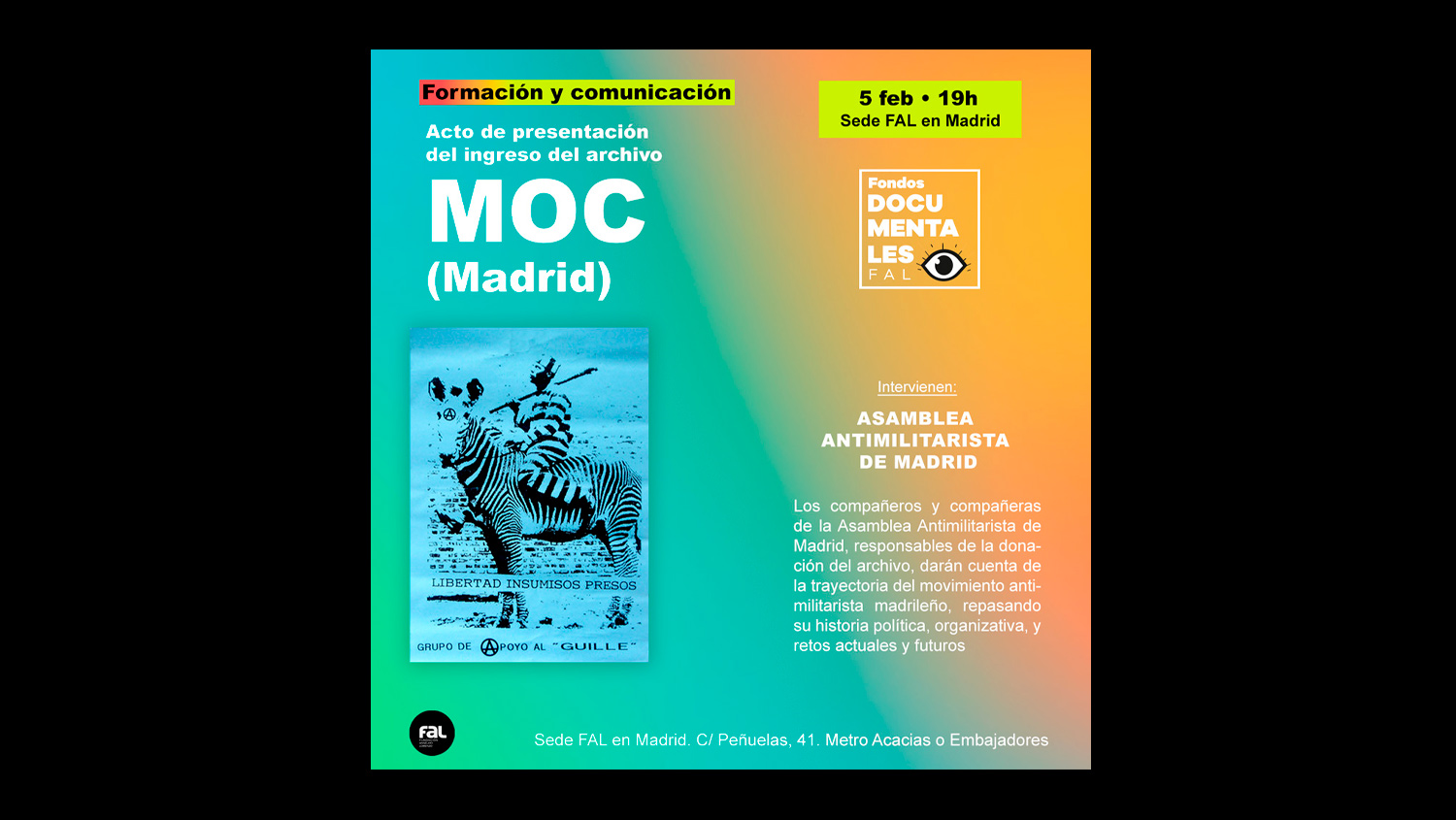 El acto también servirá como punto de partida del trabajo de gestión documental que la FAL deberá acometer en los próximos meses y que tendrá como finalidad poner a disposición pública todo este rico acervo documental, que sin duda atesora el legado experiencial de varias generaciones de militantes antimilitaristas.