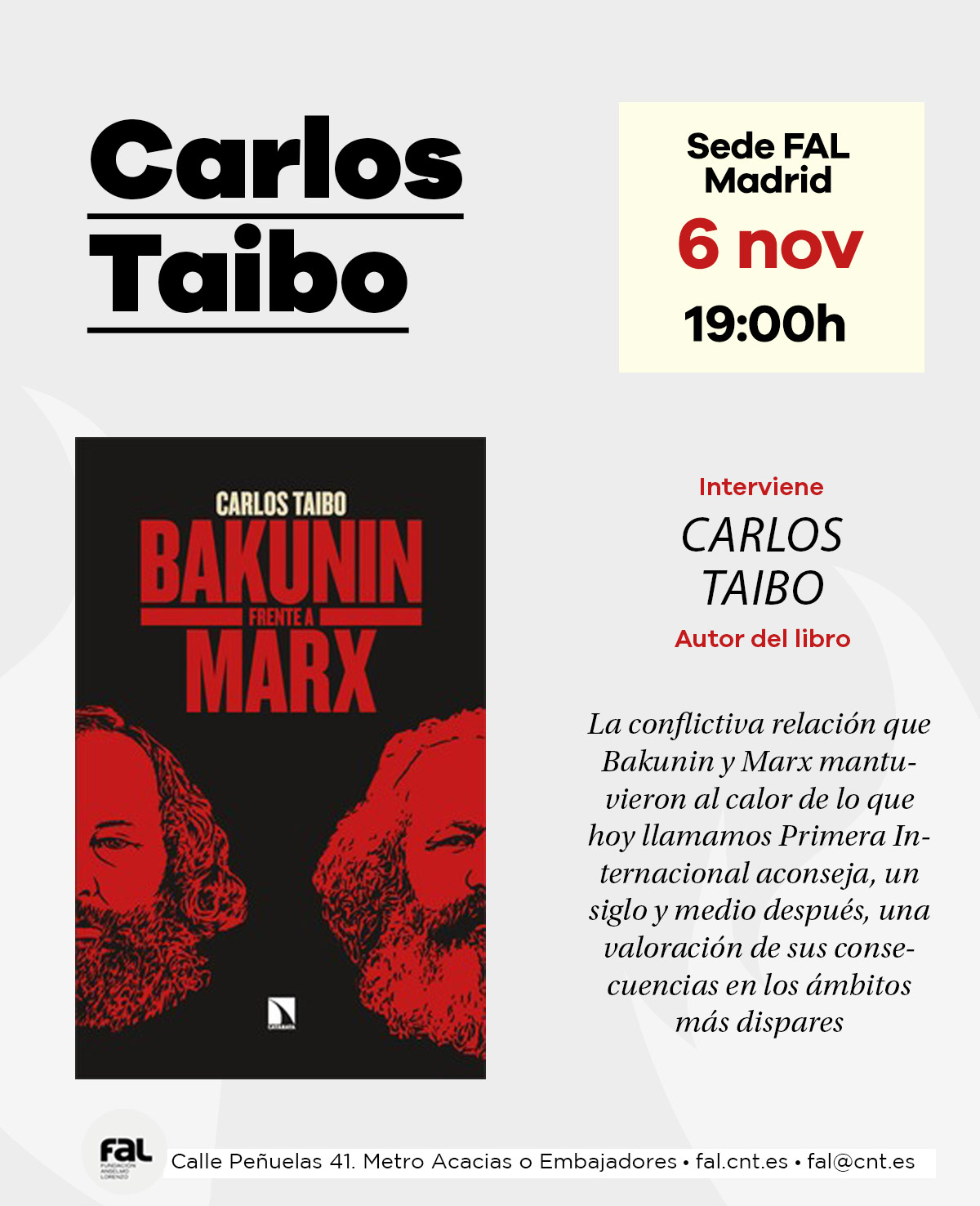 Una vez más, Carlos Taibo estará en la sede de nuestra fundación en Madrid presentando su nuevo ensayo: Bakunin frente a Marx. Será el próximo jueves, 6 de noviembre, a partir de las 19:00.