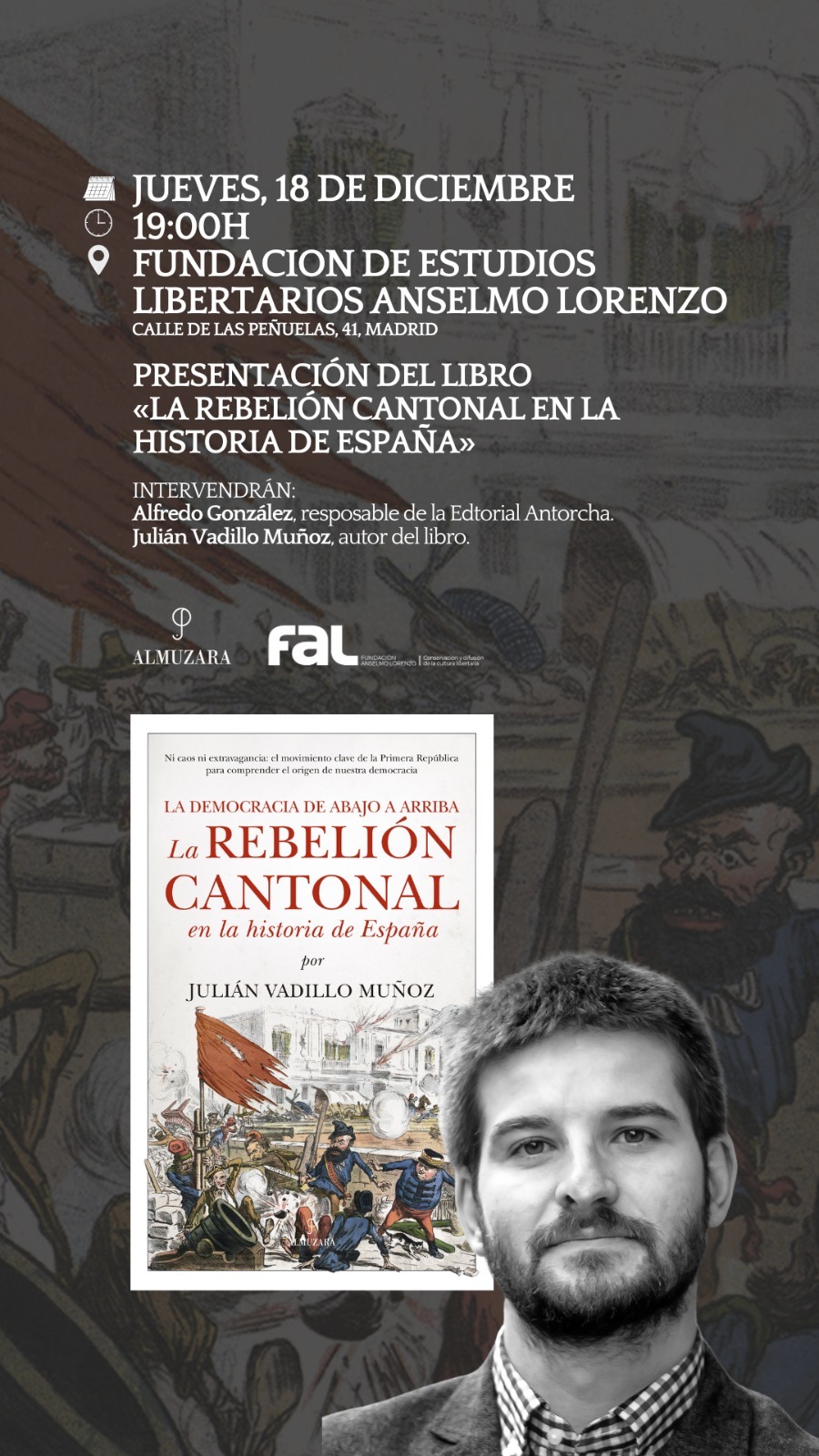 El próximo jueves, 18 de diciembre, se presentará en la sede de la FAL de Madrid el libro La rebelión Cantonal en la historia de España. La democracia de abajo a arriba. Se trata de la nueva obra de Julián Vadillo, historiador especializado en el movimiento libertario español. Una cita ineludible que arrancará a las 19:00.