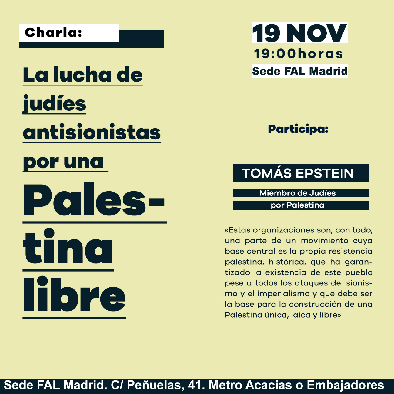 El miércoles, 19 de noviembre, tendremos la oportunidad de charlar con Tomás Epstein, realizador de documentales en Argentina y miembro de Judíes por Palestina. Será en la sede de la FAL en Madrid, a las 19:00.