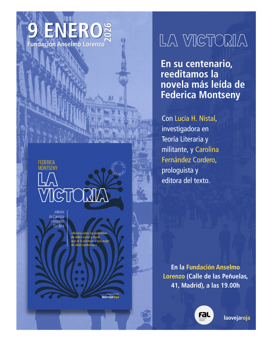 El viernes, 9 de enero, se presenta en nuestra sede de Madrid el libro La Victoria, escrito originalmente por Federica Montseny y reeditado por La Oveja Roja. Contaremos con la presencia de Lucía H. Nistal, investigadora en Teoría Literaria y militante, y Carolina Fernández Cordero, prologuista y editora del texto.