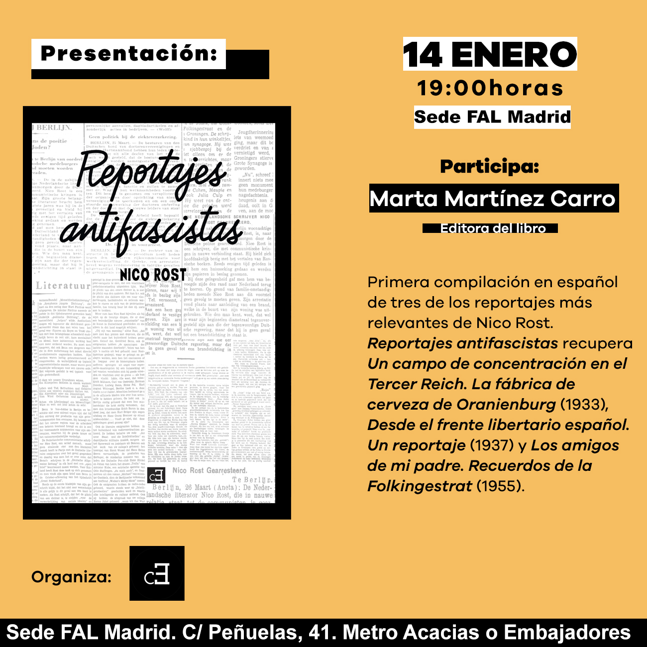 El miércoles 14 de enero, a las 19:00, se presentará el libro Reportajes antifascistas, de Nico Rost. Será en la sede de nuestra fundación en Madrid y contaremos con la presencia de Marta Martínez Carro, editora de ContraEscritura.