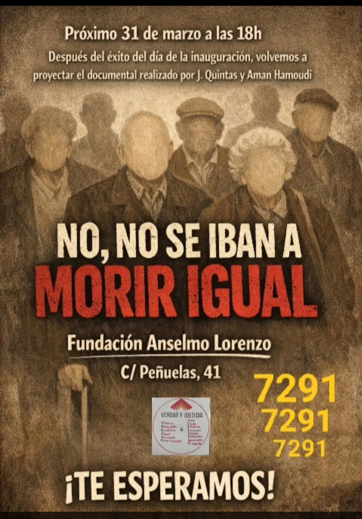 El próximo martes, 31 de marzo, la asociación 7291. Verdad y Justicia, proyectará el documental No, no se iban a morir igual. Será en la sede de la FAL en Madrid, a las 18:00, y contaremos con la presencia de sus creadores: Javier Quintas y Amán Hamoudi.