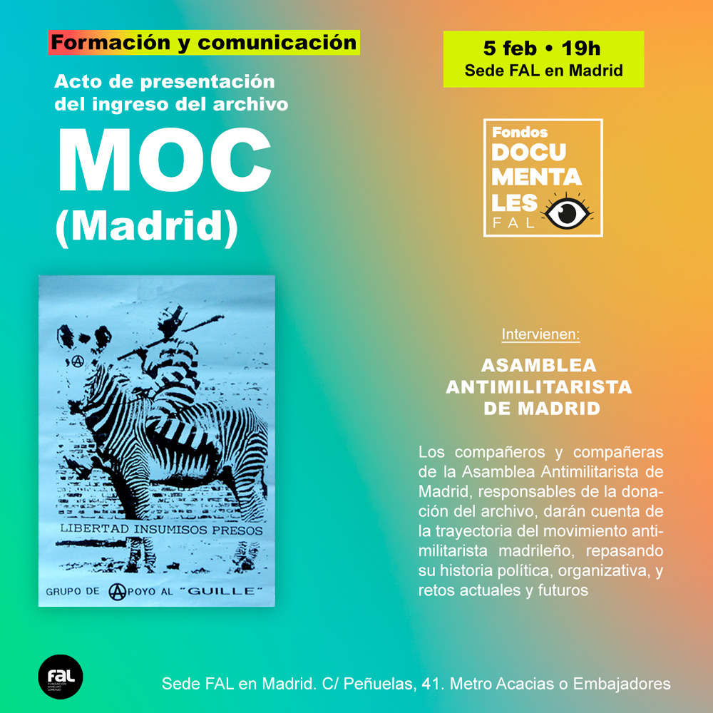 Fundación Anselmo Lorenzo C/ Peñuelas, 41, Madrid, SpainEl viernes 30 de enero se presentará en la sede de la FAL en Madrid el libro Solidaridad Internacional Antifascista (SIA) en la guerra civil española, un título que analiza la importancia de esta, a menudo, olvidada organización, creada en 1937 con el propósito de tejer una red de solidaridad con los anarquistas españoles, atacados en plena guerra civil desde distintos […]