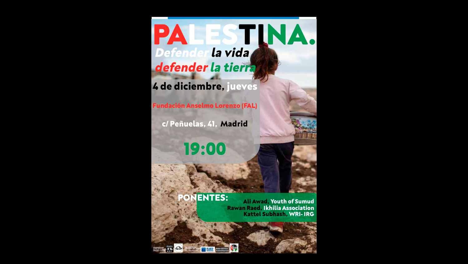 El jueves 4 de noviembre se celebrará la charla Palestina. Defender la vida, defender la tierra. Contaremos con la presencia del periodista palestina Ali Awad, la activista palestina Rawan Raed y Subhash Kattel, nepalí y miembro del comité ejecutivo de la Internacional de Resistentes en la Guerra (IRG). Será en la sede de nuestra Fundación en Madrid, a las 19:00.