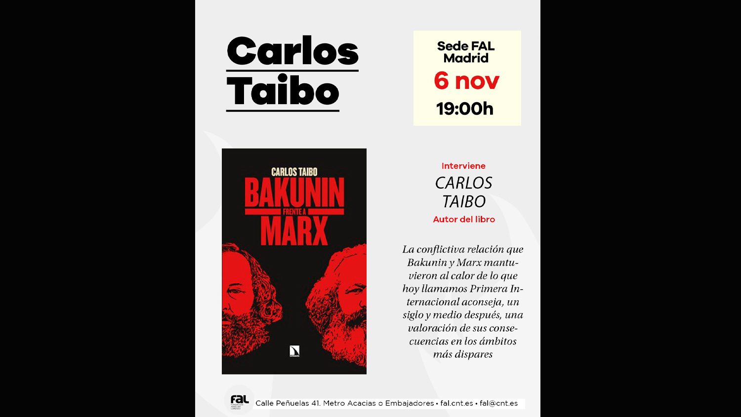 Una vez más, Carlos Taibo estará en la sede de nuestra fundación en Madrid presentando su nuevo ensayo: Bakunin frente a Marx. Será el próximo jueves, 6 de noviembre, a […]
