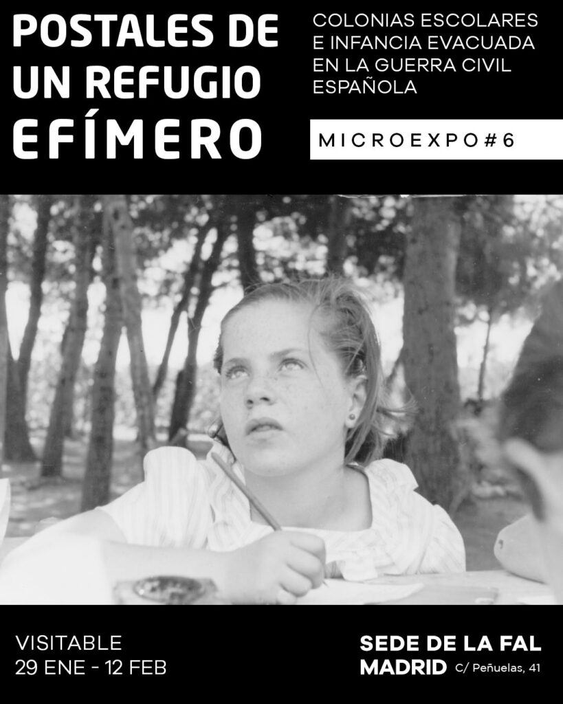 En esta sexta micro-exposición, mostramos 20 postales de colonias escolares de distintas localidades de Levante y Cataluña. Producidas por el Ministerio de Instrucción Pública en plena guerra, fueron donadas al archivo de la Fundación por el anarquista turolense José Fortea Gracia (1916-2016). En ellas se muestra la vida cotidiana de los niños y niñas en aquel refugio efímero que fueron las colonias escolares.