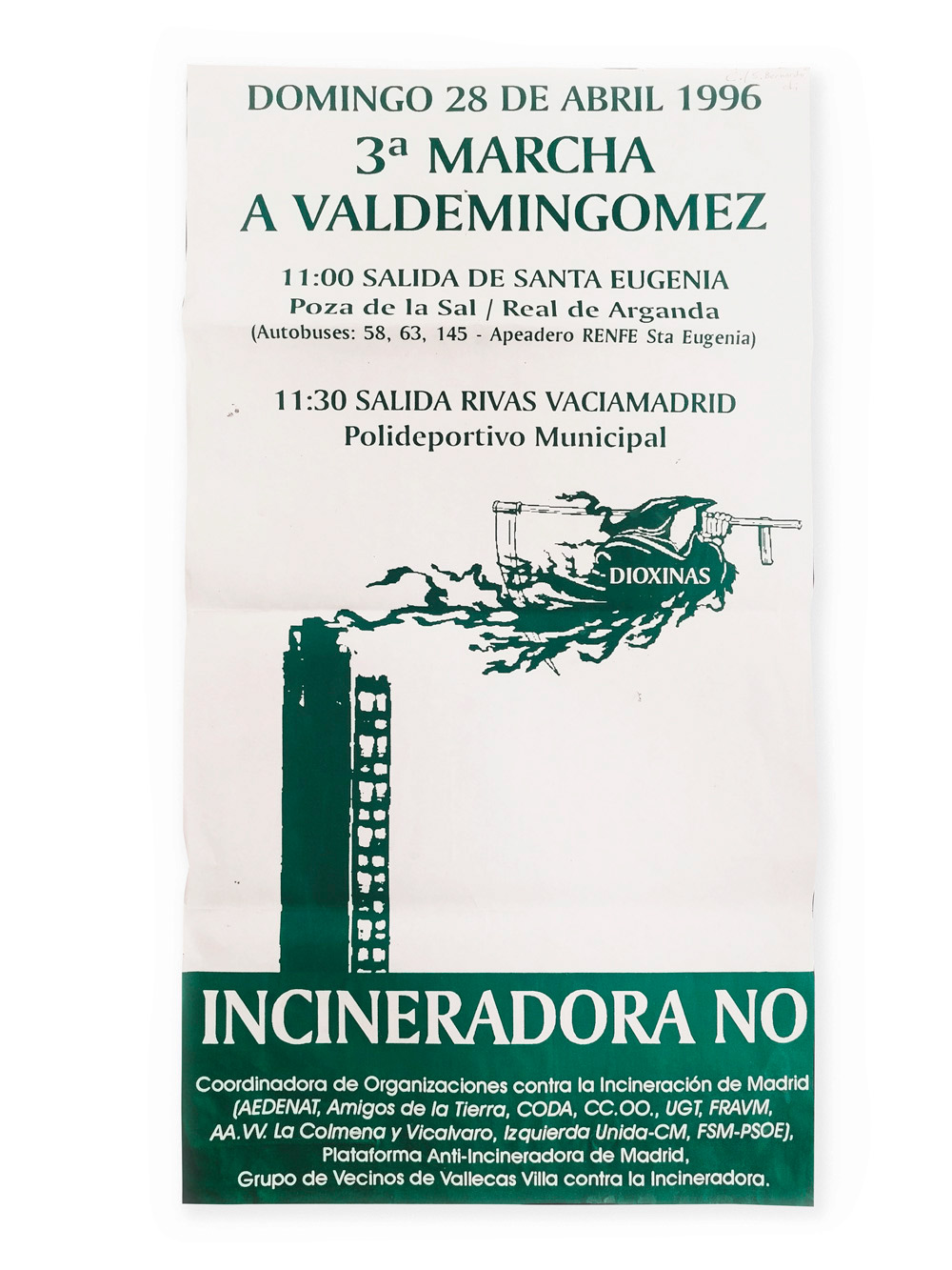 En esta ocasión se trata de un cartel del año 1996 y de una manifestación con salida en la localidad de Rivas, que atestigua una de sus muchas movilizaciones. No obstante el inicio de este conflicto partió desde el mismo comienzo de la planificación de la construcción de la planta en 1994, teniendo al barrio de Vallecas como primer foco de oposición. La iniciativa autoorganizada desde el movimiento vecinal de presentar batalla, terminó arrastrando a la oposición en la calle y al resto de organizaciones obreras y ambientalistas.