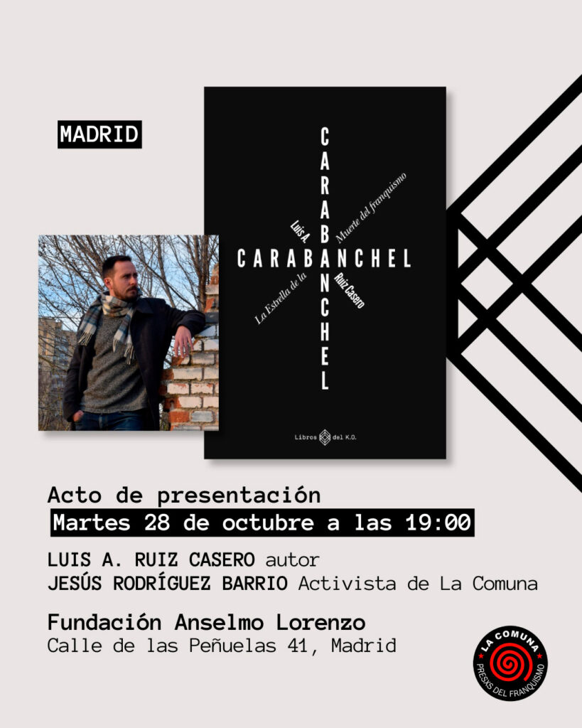 EL martes 28 de octubre se presentará en nuestra sede de Madrid el libro Carabanchel. La Estrella de la Muerte del franquismo. Contaremos con la presencia de su autor, Luis A. Ruiz Casero, y del activista de La Comuna Jesús Rodríguez Barrio.