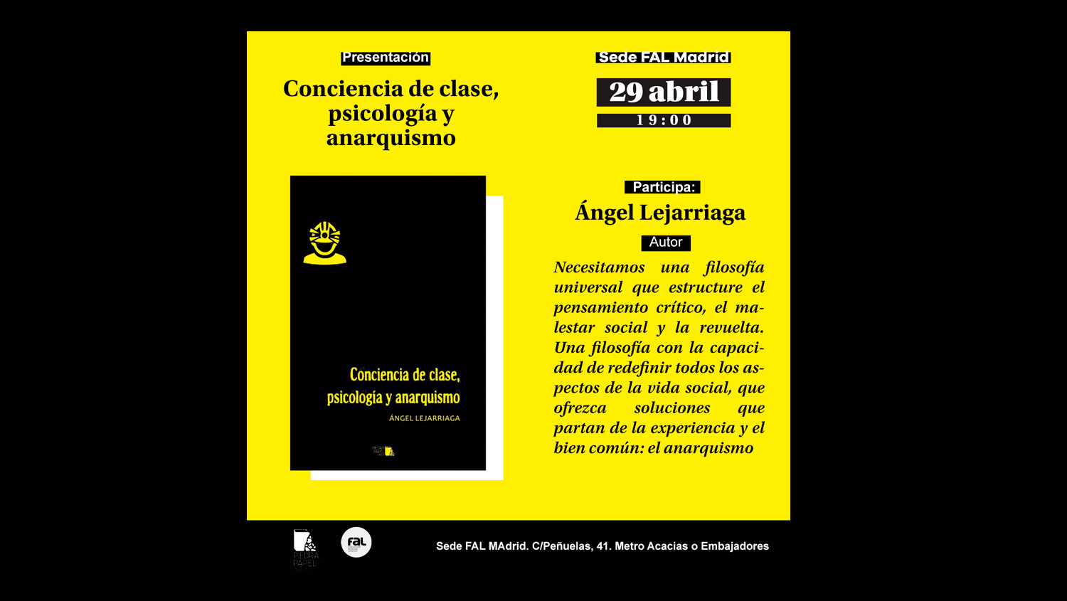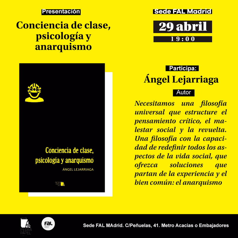 El próximo miércoles, 29 de abril, se presentará el libro Conciencia de clase, psicología y anarquismo. Será en la sede de la FAL en Madrid, a las 19:00, y contaremos con la presencia de su autor, el psicólogo Ángel Lejarriaga.