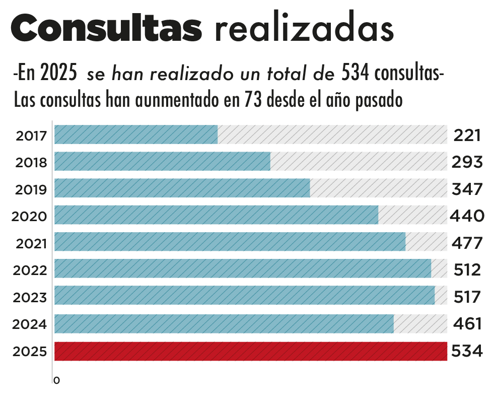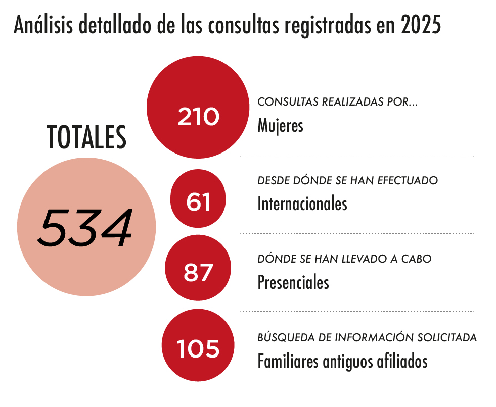 Después de 2024, cuando el número de consultas de archivo disminuyó, en 2025 hemos superado el número de consultas y peticiones de información de 2023, llegando a un total de 534 consultas, lo que supone un incremente de 73 consultas en relación a 2024.