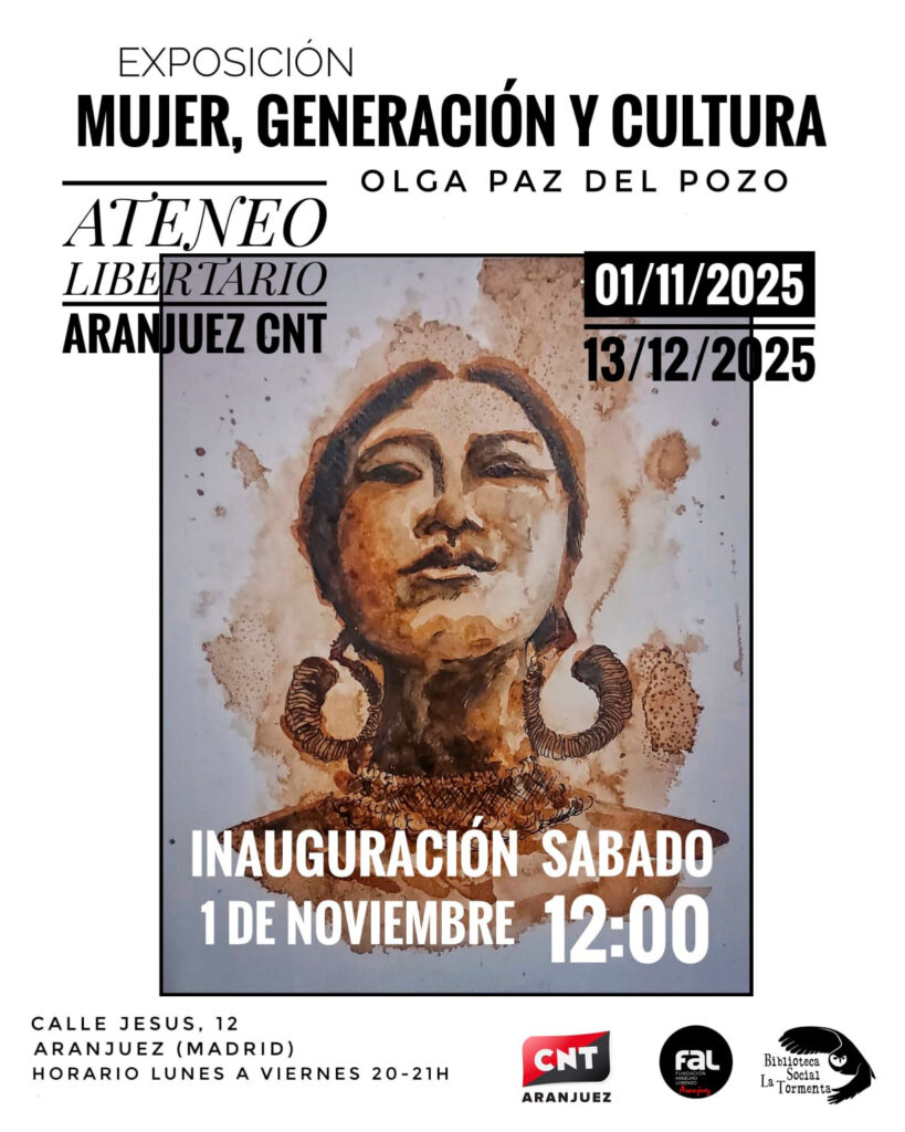Las compañeras y compañeros de CNT Aranjuez y la delegación de la FAL en Aranjuez nos invitan a acudir a la inauguración de la exposición Mujer, generación y cultura, una muestra de retratos de mujeres invisibles, anónimas, pero con historias que contar; a cargo de Olga Paz del Pozo.