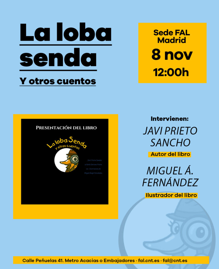 El próximo sábado, 8 de noviembre, a las 12:00 horas, se presentará en la sede de la FAL en Madrid el libro infantil La loba senda y otros cuentos. Para la ocasión contaremos con la presencia de Javier Prieto Sancho, escritor y autor del título, con la compañía de Miguel Ángel Fernández, ilustrador de la obra.