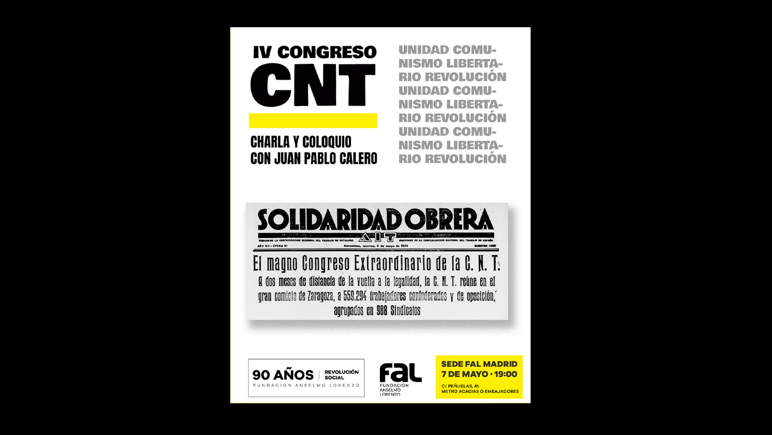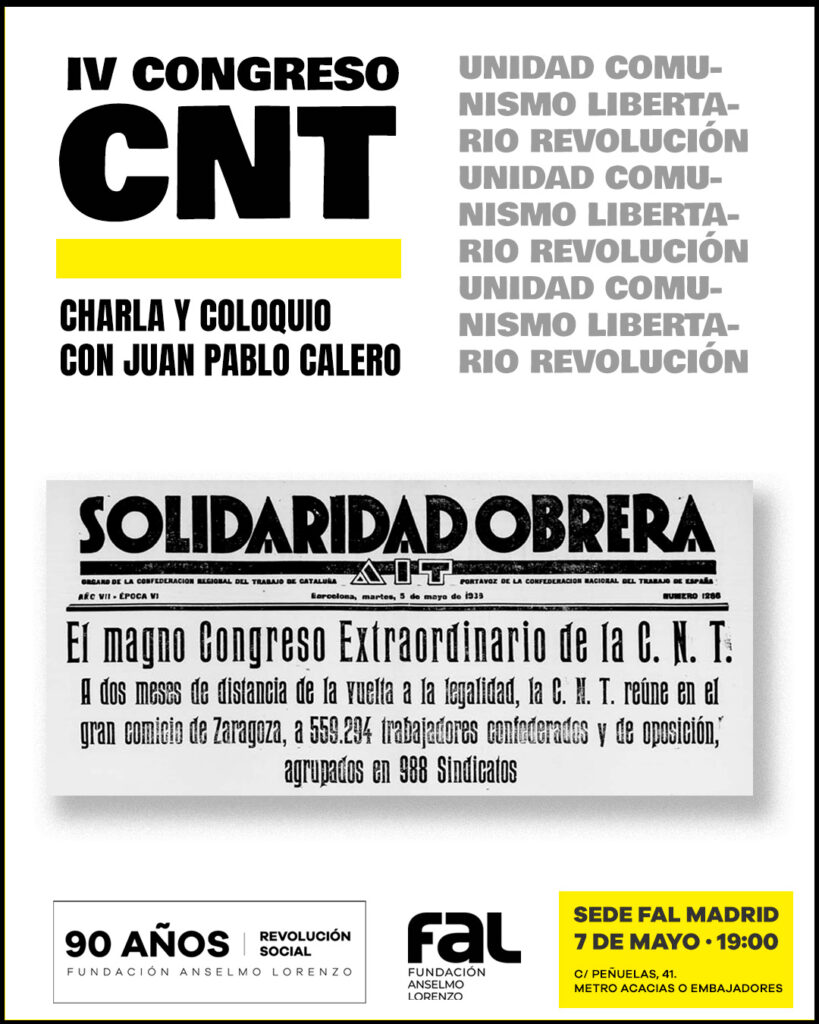 En el marco de las actividades de conmemoración del 90 aniversario de la Revolución Social, el próximo 7 de mayo, a las 19:00, organizamos en la sede madrileña de la FAL una conferencia sobre el IV Congreso de la CNT (segundo extraordinario), celebrado en Zaragoza a principios de mayo de 1936.